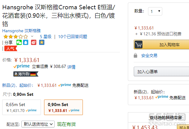中亚prime会员 Hansgrohe 汉斯格雅croma Select E 0 9米淋浴花洒 龙头套装到手价1455元 亚马逊中国 逛丢 实时同步全网折扣